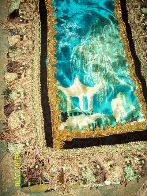 Mail from China takes some time... so I had been anxiously awaiting the arrival of the first piece, while working on the bag each evening. I had been playing with various vintage metallic trims and new fringes to compliment the piece... pieces evolve on their own time frame and rather 'create themselves' actually. Since I've had no formal training I'm quite certain a trained Seamstress and Designer would say I do it 'all wrong' and see my methods as organized chaos!? *gasp-LOL* I don't use sketches or patterns, I don't think of the end from the beginning... like the recipient, the end results will be just as much a surprise to me as it will be to them. I just know when it's 'done' and each part 'feels' complete... and then its put together to form the whole. Tim Gunn's famous phrase, "Make it work..." is definitely my Mantra! *Smiles* My old Cat, Rat Boy, often paces around me as I work or sits and watches me, inspecting each piece as if she's a Tim Gunn clone, ensuring I stay on task and the results are worthy of presenting to the World! *LOL* I have no inhibitions about colors or textures going together and I quite enjoy trying something different every time... what is YOUR vision and what colors speak to YOU... that will be the jumping off point and there's always a lovely piece of fabric in my stash that was just waiting to be called out for that Purpose... to be transformed and worked into a beautiful piece of wearable Art!