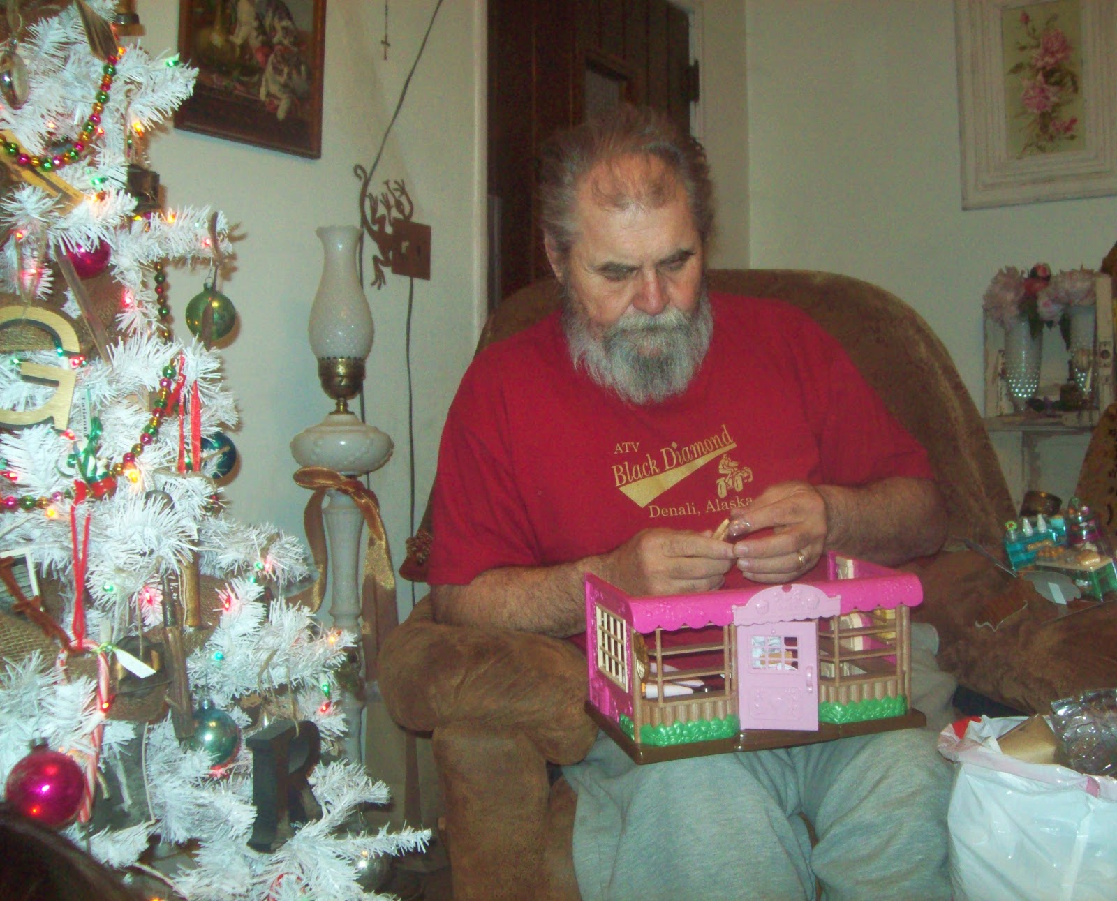 And so... we put everyone to work attempting to unpackage all of the miniscule little bits that these modern Toys always have. Here's Grandpa about ready to have another Stroke trying to unpackage the 200+ adorable miniature pieces that accompanied Princess T's 'Lil Woodzeez' Bake Shop and Grocery Store and which the Manufacturer secures in such a way that you need to be Chris Angel to know the Magical Trick that unlocks it all... because it is indeed a Mind Freak?!