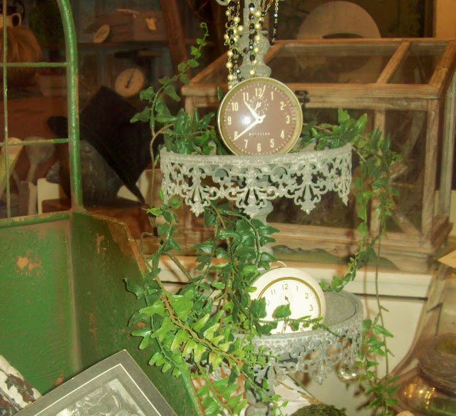 Trailing Ivy, Ferns, Old Clocks, Rosary Beads and Iron Tiered Filigree Stands... compliment each other so well!