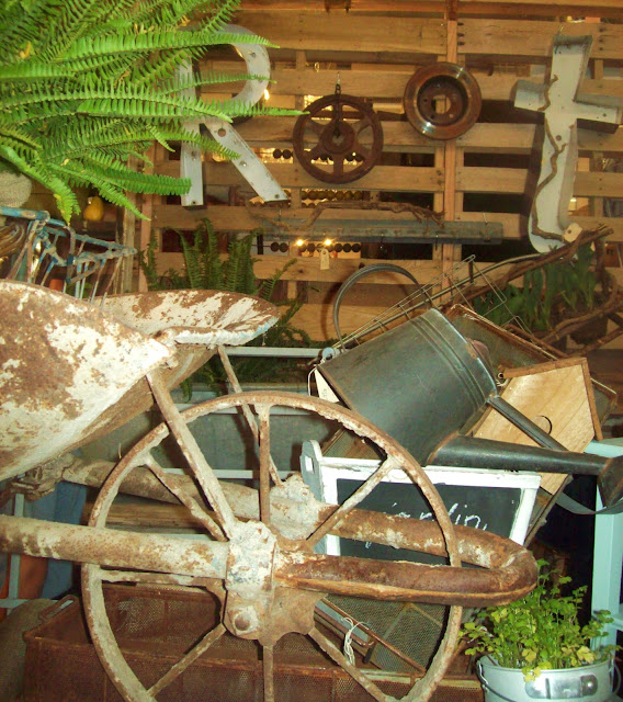 Loved the innovative "Root" Sign comprised of oversized Commercial Letters and Old Farm Cogs and Wheels... in fact Galvanized Garden items and Rusted Farm Equipment are always such Fun to Style with.