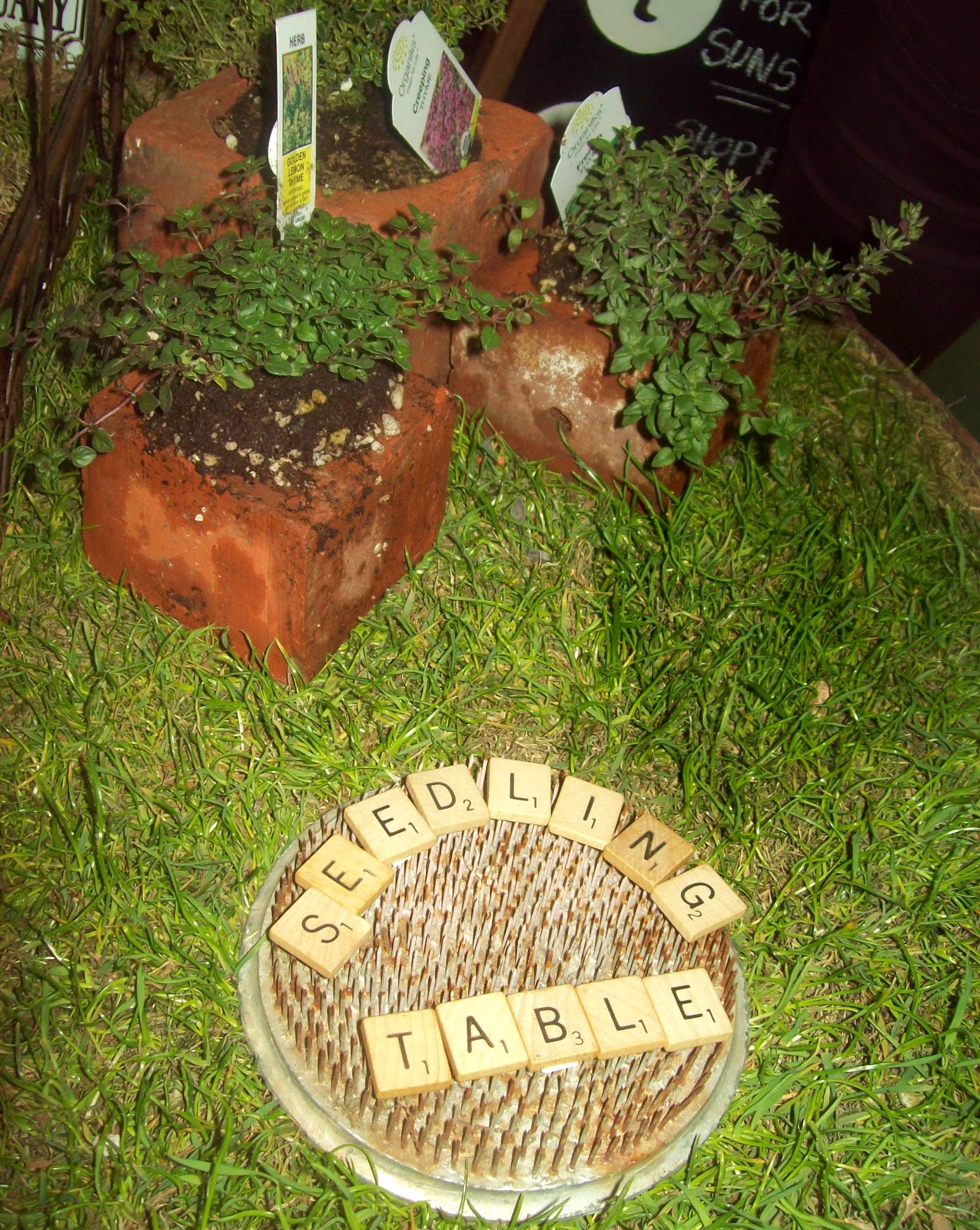 Hi... so glad you could come back and rejoin us at the SWEET SALVAGE "Green Acres" Event my Friends. Often the smallest details provide the biggest doses of Inspire for me... like brick fragments filled with soil to house Fresh Herbs... Metal Flower Frogs holding assortments of Ephemera and Scrabble Tile Messages...
